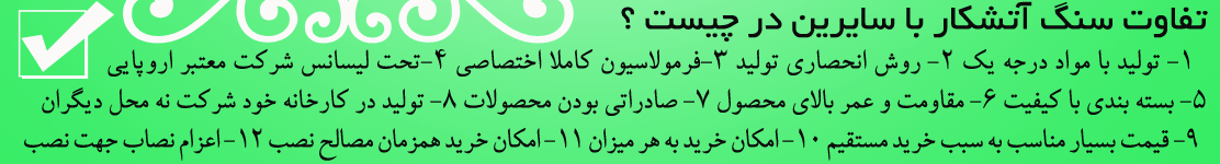 تفاوت سنگ آتشکار با سايرين در چيست ؟ -1 توليد با مواد درجه يک 2- روش انحصاري توليد 3-فرمولاسيون کاملا اختصاصي 4-تحت ليسانس شرکت معتبر اروپايي -5 بسته بندي با کيفيت 6- مقاومت و عمر بالاي محصول 7- صادراتي بودن محصولات 8- توليد در کارخانه خود شرکت نه محل ديگران -9 قيمت بسيار مناسب به سبب خريد مستقيم 10- امکان خريد به هر ميزان 11- امکان خريد همزمان مصالح نصب 12- اعزام نصاب جهت نصب